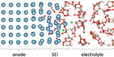 Schematic of a solid-electrolyte interphase forming between a metal anode and an electrolyte containing a salt dissolved in ethylene carbonate solvent. Generated using ab initio molecular dynamics.